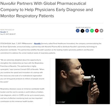 Novartis Pharma distributed NuvoAir's AirSmart spirometry technology to physicians worldwide. We aimed to address the unmet medical needs of respiratory patients by increasing the number of lung function tests via the easy to use & access mobile spirometer.