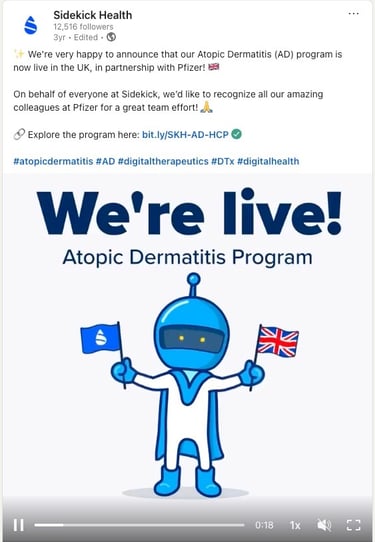 At Sidekick Health we developed companion apps in Atopic Dermatitis, Rheumatoid Arthritis, and Breast Cancer. We co-created with our global and local Pharma partner teams the go-to-market strategies, and launch plans. Launch and promotional activities were executed by our team in multiple EU markets. User adoption, as a critical KPI was constantly tracked and improved.
